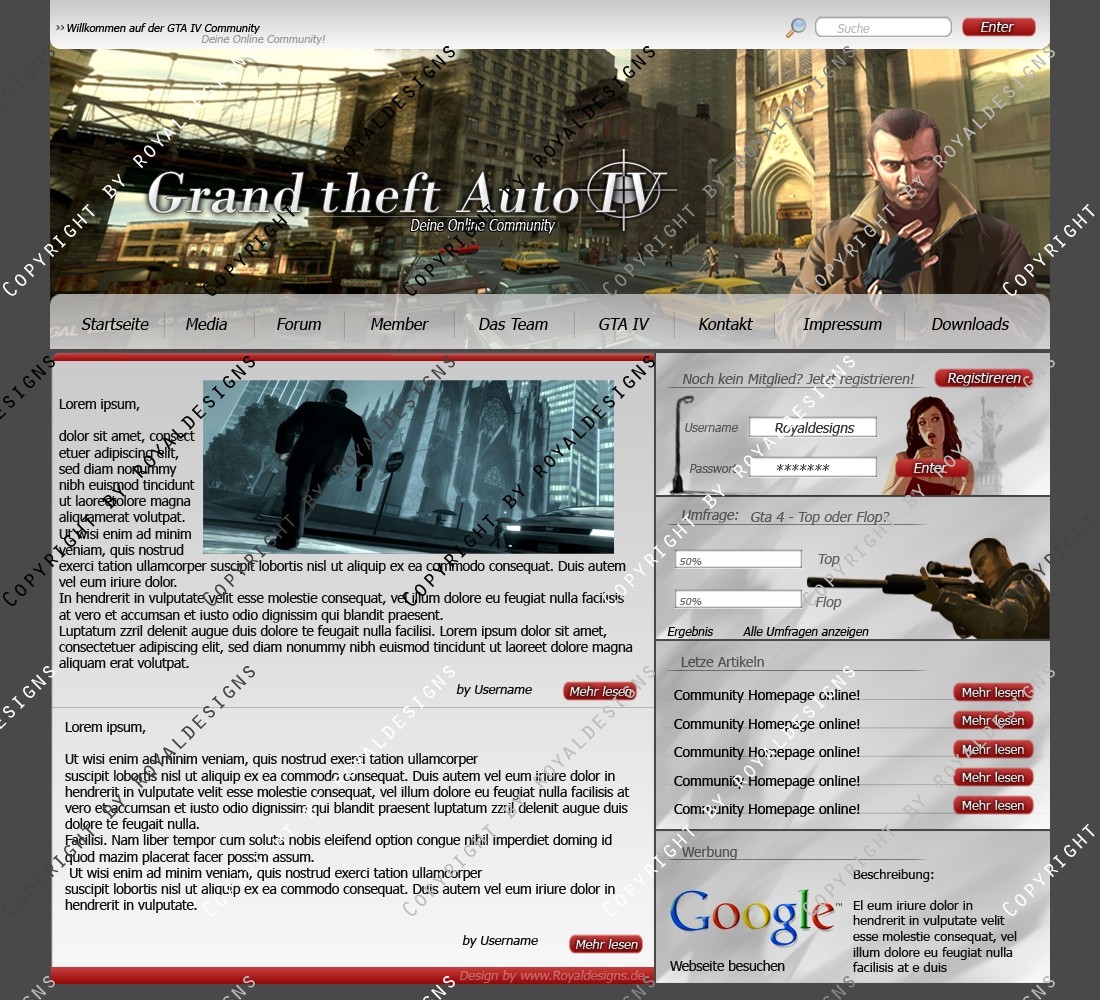 Das Design ist an eine Community angelehnt. Speziell auf eins für das berühmte Spiel des Jahres "Gta IV". Es sind einige elemente eingearbeitet worden, z.b. in dem Loginbereich und weiter runter. Die Gestaltung nimmt die Farben Rot / Weiß an und so ist es geblieben, schlicht und einfach gehalten.Im Packet wären folgende Sachen enthalten: - .psd Datei des Designs - WerbebannerHeader und weitere kleinigkeiten können kostenFREI geändert werden.