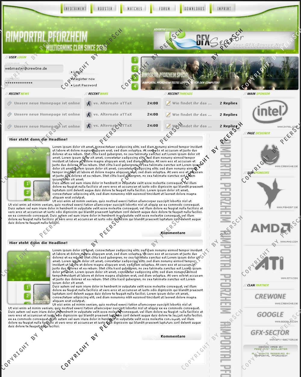 Zu einem meiner Meinung nach unschlagbaren Preis! Was Sie hier kaufen ist lediglich die PSD Datei, gerne kann ich es Ihnen gegen einen Aufpreis von 12,50€ an ein CMS Anpassen, zur Auswahl stehen hierbei: webSPELL, Clansphere, Teklab, Devilz und andere CMS auf Anfrage ohne Aufpreis.
