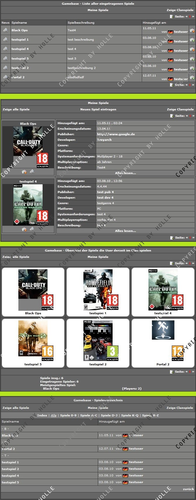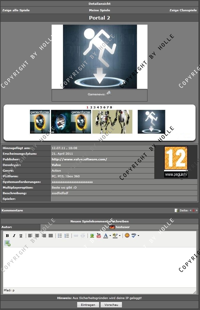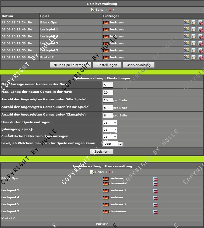 Angelehnt an das System der ESL habe ich hier eine Verwaltung für Spiele im Clan oder in der Community gecode, für die sich Member eintragen können. Zusätzlich können die Member im Clan eigene Spiele einreichen, indem sie ein Formular ausfüllen. (Dieses Feature kann aber vom Admin abgeschaltet werden)