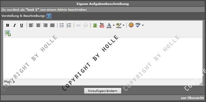 User, die in der Aufgabenverwaltung gelistet sind, können einen eigenen Text definieren und sich so zB Vorstellen oder eine eigene Stellenbeschreibung hinzufügen.