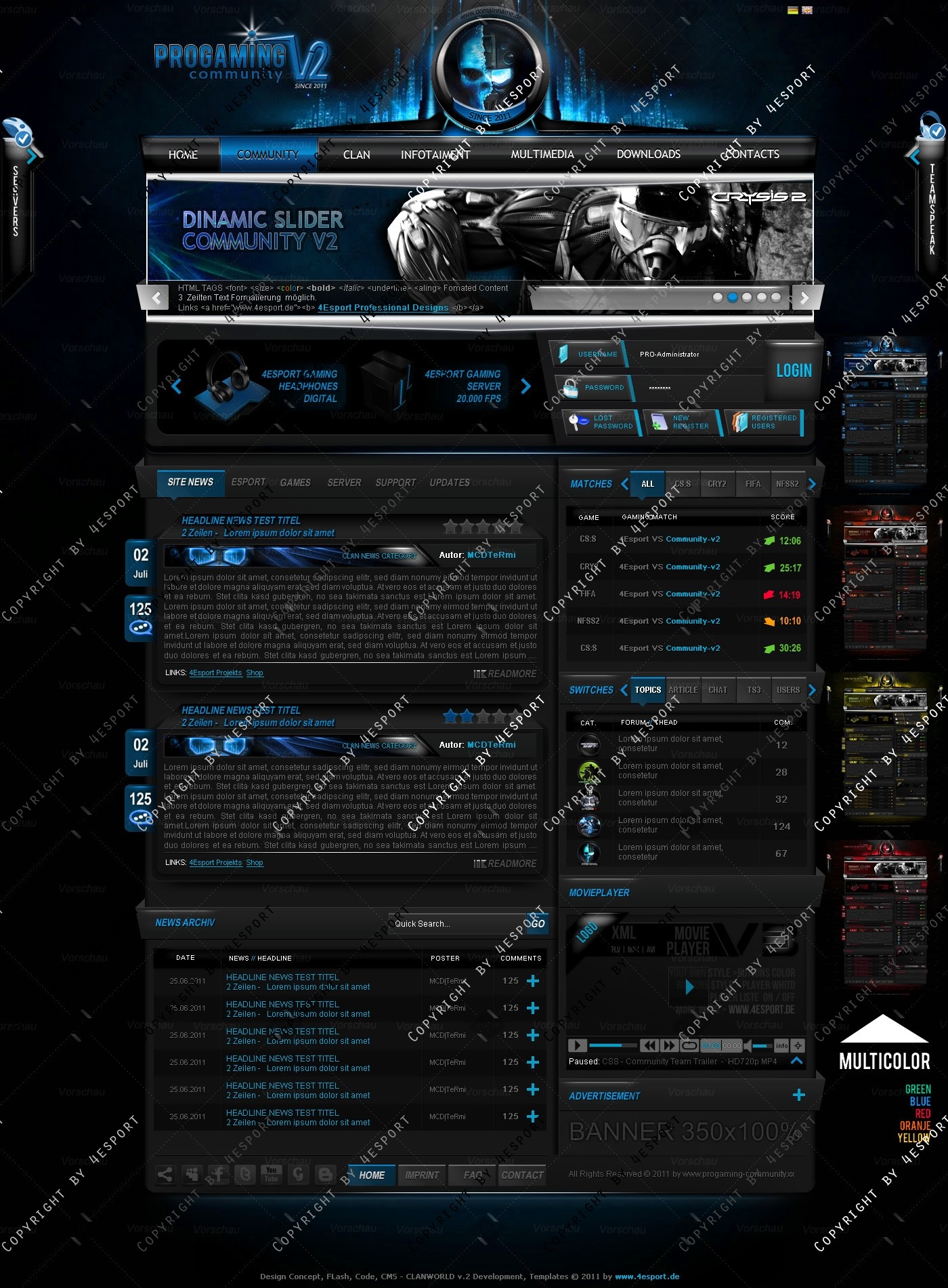 PROGaming Community V2 - Templates Premium Edition mit Flash Player 1 V3 Custom Edition und Featured System, CMS Erweiterung Webspell 4.2.2a, wird auf wünsch auf ClanWORLD v1.1 auch gecodet.
