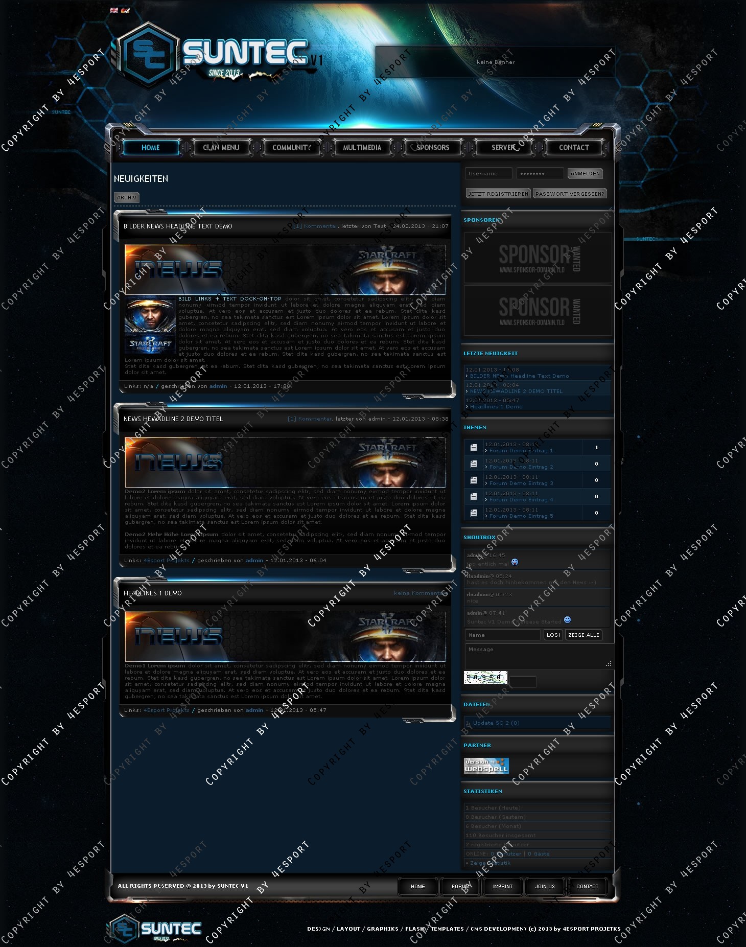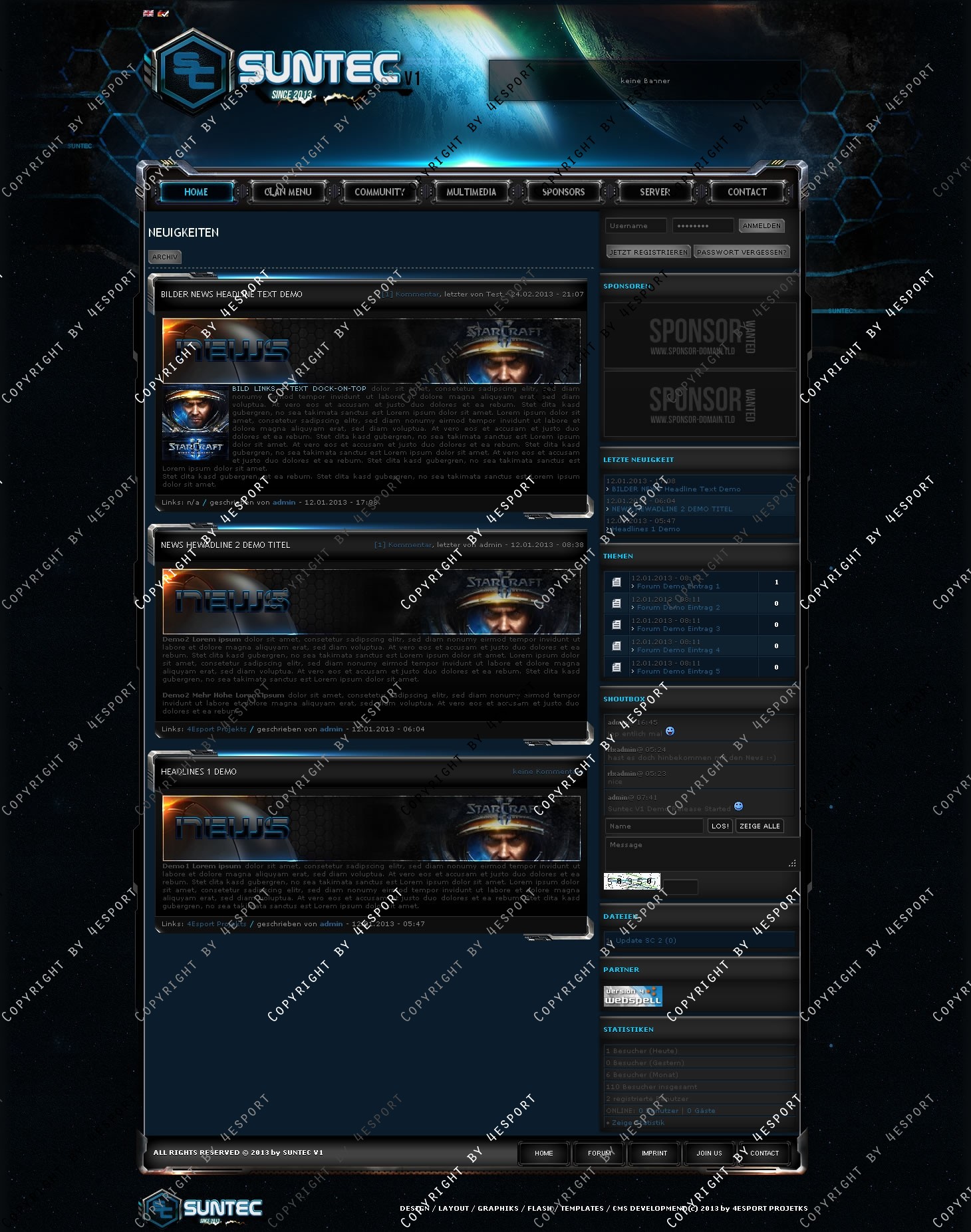 • Sie erhalten hier einem Professionellen Design, Programmiert, Implementiert und Vollständig angepasst an webSPELL CMS ab Version: 4.2.3 x